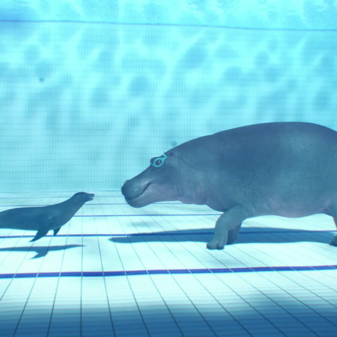 Une otarie enseigne à un hippopotame empoté comment faire une culbute sous l’eau en vue de remporter la finale du 100 mètres.