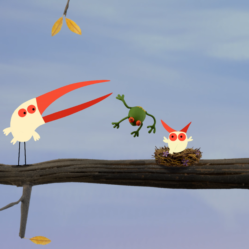 L’oiseau noir et l’oiseau blanc construisent joyeusement leurs nids. Chacun pond un œuf, puis le couve. Au bout d’un certain temps, deux oisillons éclosent. Les deux oiseaux essaient alors d’apprendre à leurs oisillons à manger, à chanter et à voler mieux que celui de l’autre.